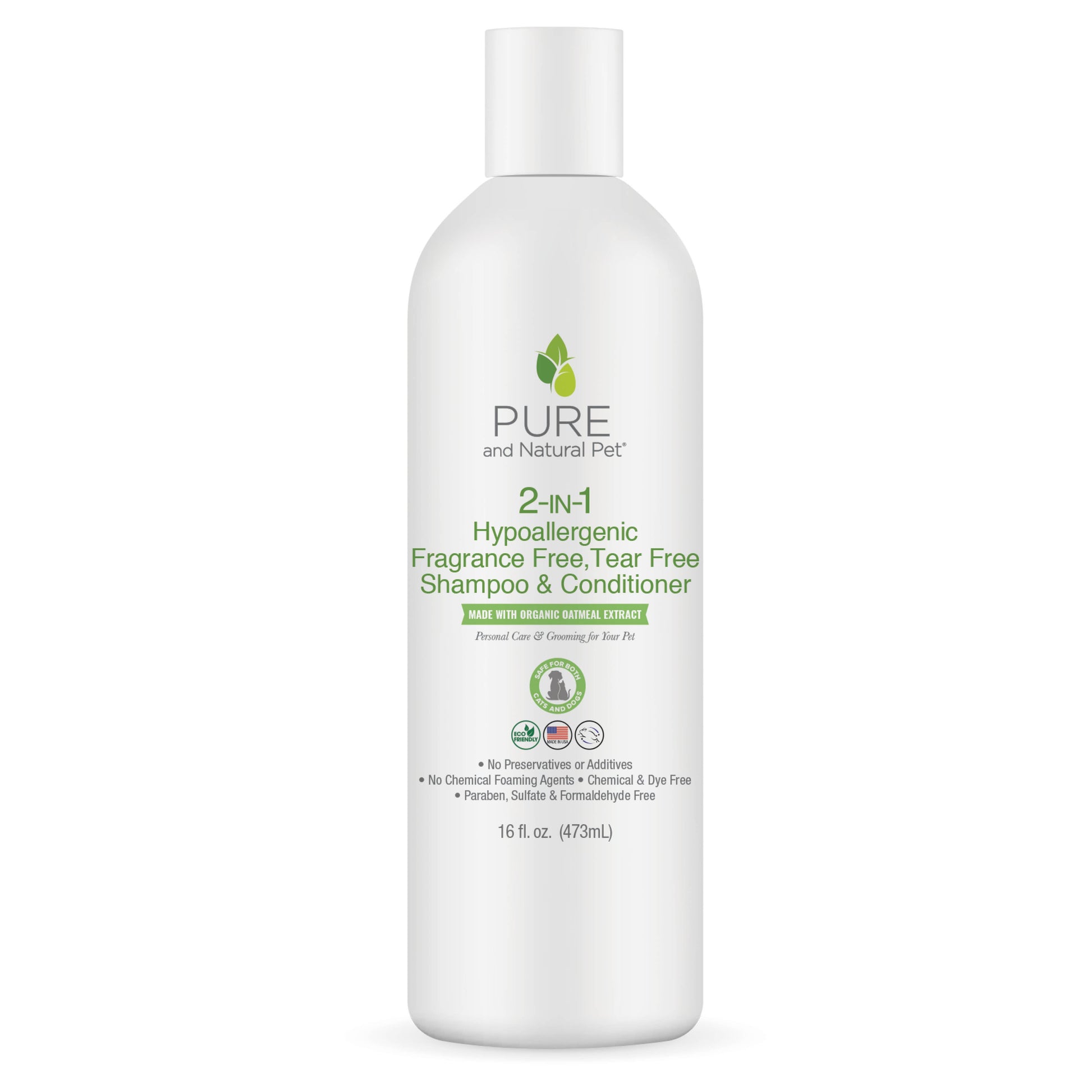 Size: 16 fl. oz. ✓ Tear Free Formula ✓ Paraben-Free ✓ Sulfate-Free ✓ Formaldehyde-Free ✓ Safe for Cats ✓ No Synthetic Dyes or Perfumes ✓ PH Balanced ✓ Made in the USA with Globally Sourced Ingredients Nourish and enrich your dog or cat’s coat with our Hypoallergenic Fragrance Free Tear Free Shampoo & Conditioner. This unique 2-in-1 saves time and is specifically formulated for sensitive skin. Give your beloved pet the luxurious treatment they deserve with our hypoallergenic shampoo and conditioner. Made with safe and gentle ingredients from around the world, we guarantee this 2-in-1 formula will cleanse and condition without causing any irritation to their delicate skin. Free of harmful chemicals and strong scents, this pH balanced product will leave your furry friend's coat soft, shiny, and smelling fresh. Pamper your pet and make bath time a stress-free experience for both of you.